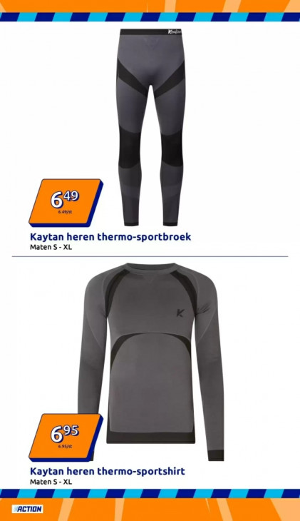 Deze tekst wordt automatisch gegenereerd, dus deze kan fouten bevatten.49) 6.49/st g Kaytan heren thermo-sportbroek MatenS-XL 95 6.95/st MatenS-XL Kaytan heren thermo-sportshirt ACTION
